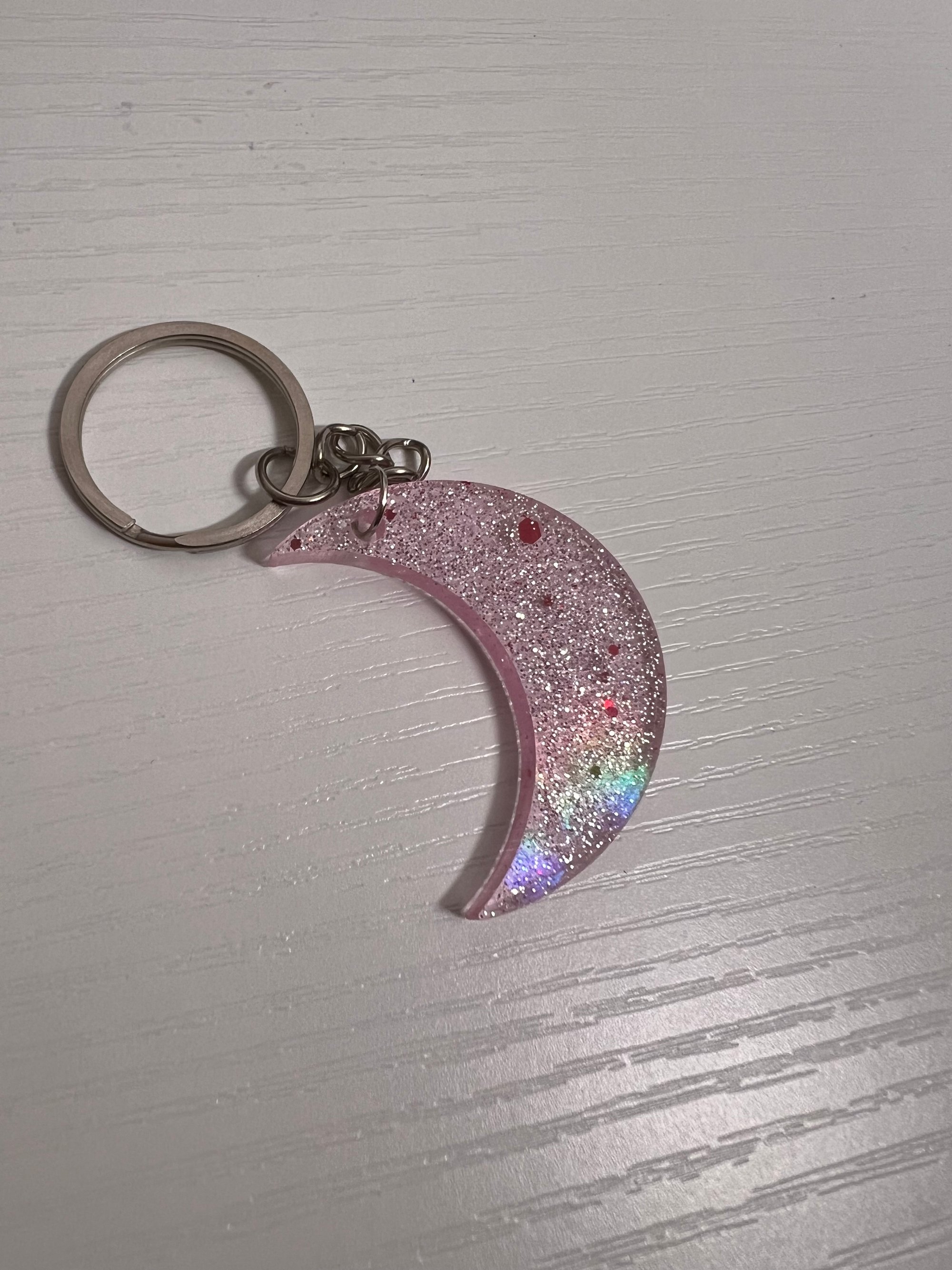 Porte clef en forme de lune transparente rosée avec paillettes et un effet holographique