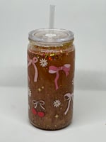Verre snow globe avec noeuds rose, fleurs et cerises